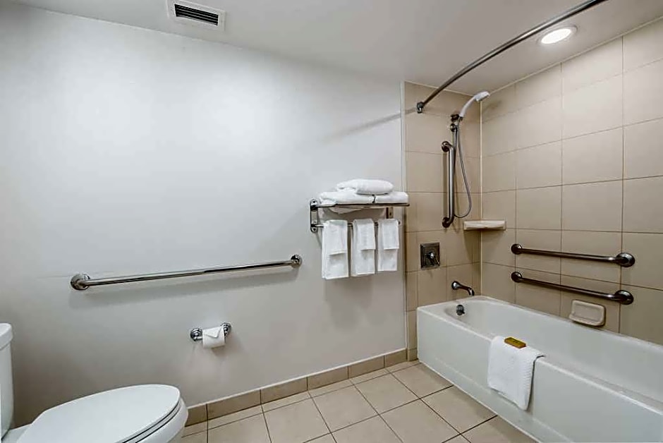 Enjoy the same attractive, spacious rooms with all our coveted amenities plus features preferred by our special needs guests. This mobility and hearing accessible standard room features one king-sized bed, has a minimum 40-inch clearance on all doorways and between furnishings, making chair maneuvering easy. Our vanities and closets are constructed to provide convenient access. This bathroom offers an accessible tub. Weekday (Monday-Friday) delivery of newspaper. Any corresponding photo may not reflect the specific accessible room type or room feature.